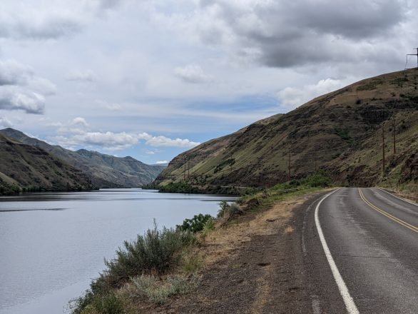 There is a tough 6 kilometre climb out of town during which I high fived a couple of touring cyclists who had stopped for a breather, and then a very fast descent. From there the route trends gently downwards in a north easterly direction for approximately 30 kilometres before abruptly coming across the extraordinary Hells Canyon, a deep gorge of the Snake River (the largest tributary of the mighty Columbia River) that forms part of the boundary between Oregon and Idaho and separates the Wallowa (Oregon) and Seven Devils (Idaho) mountain ranges.