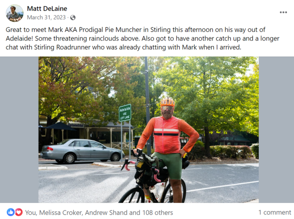 A nice chat with dot watcher Mark who had kindly came out early Friday morning to welcome me to Adelaide.