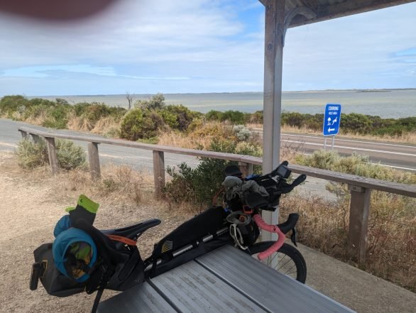 I rolled into Meningie at around 11am which had a distinct early Easter holiday feel about the place – plenty of Caravanners (I doubt they’re called Gray Nomads this far east?) and people milling about on the main street. My route notes indicated that the only services between here and Kingston 150k’s up the road was a roadside mobile coffee set-up at Salt Creek which I absolutely wasn’t going to rely upon being open.