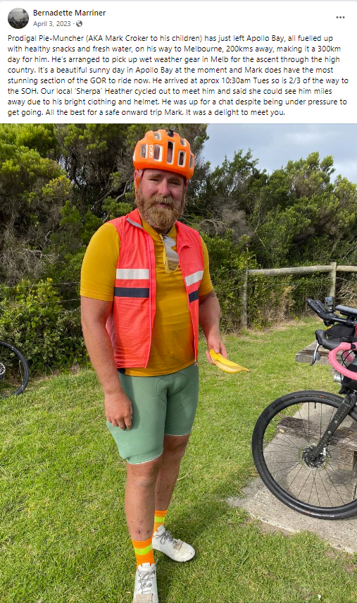 Tuesday April 4, 2023: I was pleasantly surprised by the very well behaved drivers on the Great Ocean Road. Very familiar with cyclists perhaps?