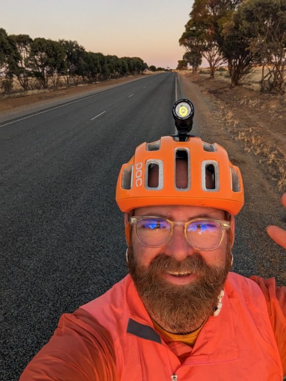 After extracting myself from my sleeping bag the first item of business was to postpone a rather urgent call of nature to hobble after my bivy which was in the process of blowing away. Due to a slight breeze I’d secured the bivy to my bike, preferring to sleep under the stars. This morning the breeze had stiffened somewhat and as I adjusted the position of my bike to access an oat bar from my feed bag, the bivy was off, moving rather more quickly than a barefooted MAMIL in the pitch dark. The rather crucial part of my sleep system snagged on a bush not too far away thank goodness. Disaster averted.