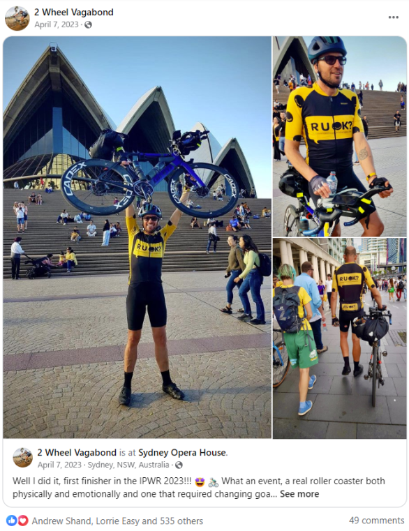 Speaking of the latter I found out that Raymond Friedrich (aka “2 Wheel Vagabond”) had just rocked up to the Opera House, the winner of the 2023 Indian Pacific Wheel Ride. An extraordinary ride! Chapeau!! And for a great cause too.