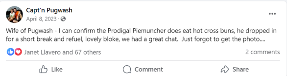 As I was unsheathing myself from extra layers, long pants, gloves and extra socks I received an Afternoon Tea invitation from Tim James’ (aka “Pugwash”) wife Sue?? (aka “Wife of Pugwash”)……yep, I just confused myself too.