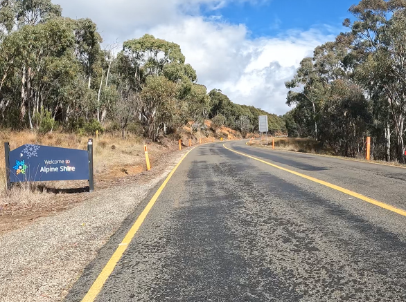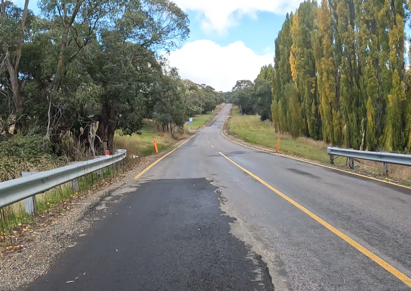 Saturday April 8, 2023: Cruising to Bright. The road from the right would have been the road used if the route to Falls Creek hadn’t been closed.