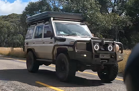 Saturday April 8, 2023: A very typical specimen. Raised suspension – check! Older model Nissan Patrol, Toyota Landcruiser or Toyota Hilux – check! Two-way radio antenna – check! Bullbar – check! Snorkel – check! Stickers on windows – check!