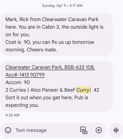 Arranging accomodation in Tintaldra was far from an easy process – almost non-existent phone service, missed calls, text messages left etc, etc.
