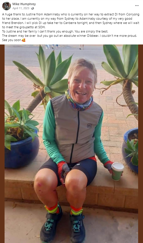This was also the day that I found out Di had to pull out of the ride. Her and Matty Smith were ‘my people’ out there. A sad moment for all and one that I am sure stung Di the most. Knowing Di though, as I feel like I do now, she will only use that disappointment as grist for the mill, to fuel the determination for the 2024 ride.