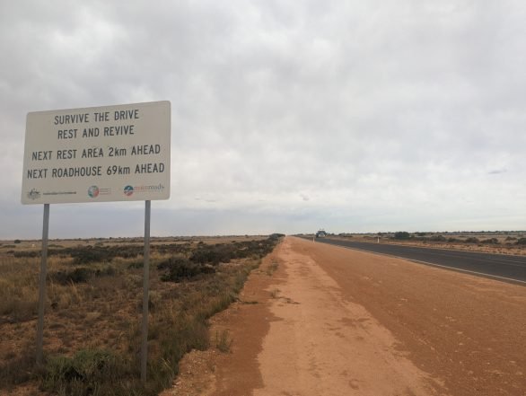 Back onto the Eyre Highway at 7:18am. Despite the chipper video below I struggled a bit early with lethargy and getting into a rhythm, so I took advantage of a couple of rest stops to push some more calories down – 2 x 5 minute breaks in the first 20 odd kilometres.