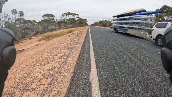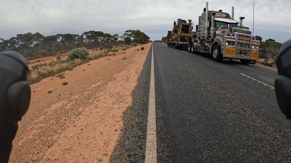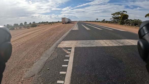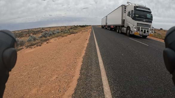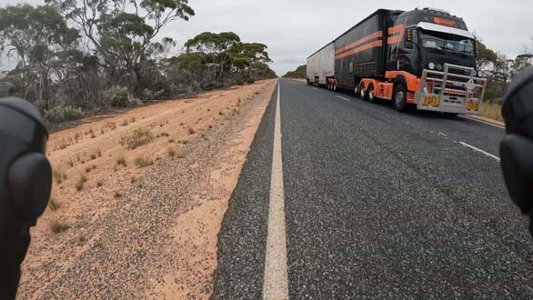 Thursday March 23, 2023: Road train approaching from behind. Notice how they have already moved to the other lane to overtake me.