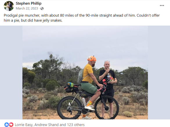 - 2 x Dotwatcher’s – Keen cyclist Stephen Phillip and his partner (sorry, I can’t remember her name) who so generously stopped en route back to Perth for a chat and to supply me with much needed Snakes Alive. You can never have too much of a good thing. I could have done without the; “you’ve got a long, long way to go on the straight road”, though……😂😂😂