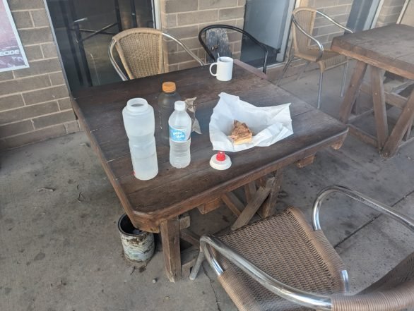 I avoided the restaurant and went straight to the adjacent service station which was on the small side, but I assumed they would have all the necessary food groups. I was only 20k’s behind Di now and wanted to keep stoppage time to a minimum.