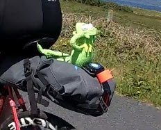A broad smile on the cyclist charmed me into slamming on the brakes to allow him to get back on his bike and catch up. I was glad that I did. It was local Irish lad Alan Hyland from Westport along with his companion Kermit the Frog who was kicking back atop Alan’s saddle bag, webbed hands on head staring directly up at Alan’s backside.