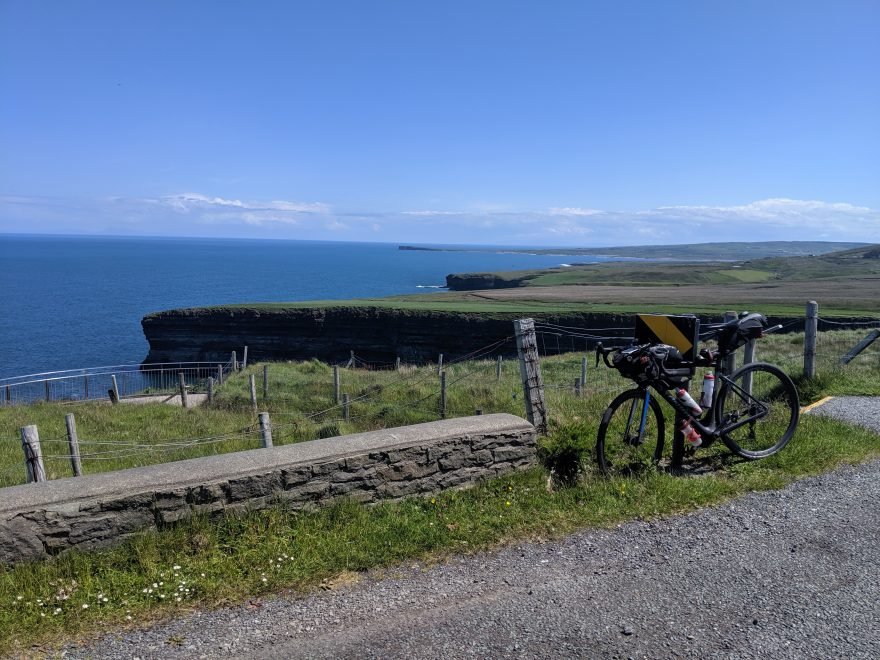 I caught up with Tim and we rode together for a while up the long hill that led out of Ballycastle to the coast. Around a bend and we came across yet another Wild Atlantic Way tourist stop. Céide Fields, the most extensive Neolithic site in Ireland and home to the oldest known field systems in the world, dating back to circa 3,500 BC. I admit I was completely ignorant to this fact at the time, assuming the gathered crowds were there to take in the dramatic views of vertical cliffs looking out to a perfectly azure blue Atlantic.