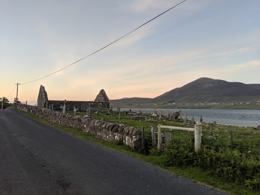 I was greeted into the town of Achill at around 5:30 pm by dot watchers Marion and her partner Kevin from England who were camper-vanning around Ireland. Kevin completed the 2011 Tour Divide which got Marion into dot watching and she hasn’t looked back, a dotwatching veteran of subsequent Trans Continentals and now the Trans Atlantic Way. We had a lovely chat, they took a few photos and then I rolled over to the SuperValu Supermarket for a meal and to stock up on supplies for the nights riding.
