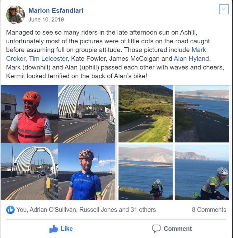 Monday June 10, 2019. Marion’s post on the Trans Atlantic Way Page. My man Tim Leicester in the Blue Jersey.